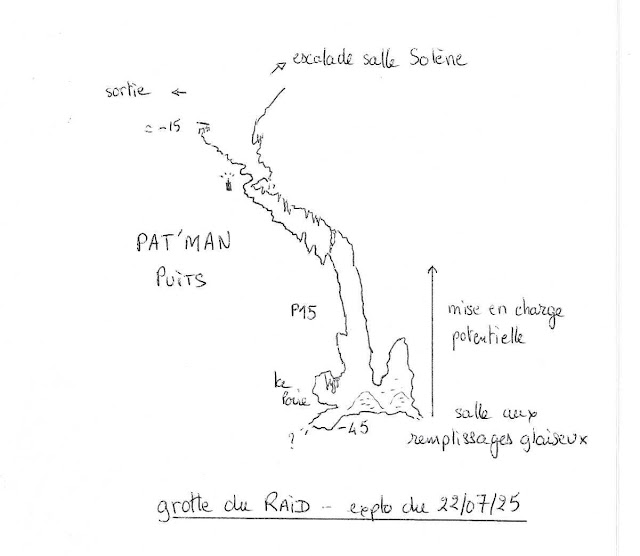 Dans un soutirage de la salle Solène au Raid, juste à l'aplomb de l'escalade de Gilles qui avait permis d'atteindre son sommet, nous avions débuté une désobstruction qui semblait déboucher dans un puits relativement profond. De temps en temps, les cailloux arrivaient dans de l'eau ; la position étant stratégique et à l'écart de l'axe du collecteur, nous avons repris en une paire de sorties l'ouverture de ce pertuis.